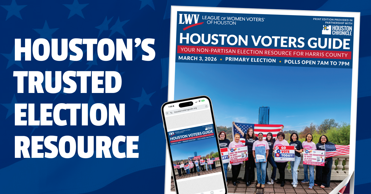 For over 105 years, the League of Women Voters of Houston has provided nonpartisan election information to Harris County voters. Our guide makes it easy to: